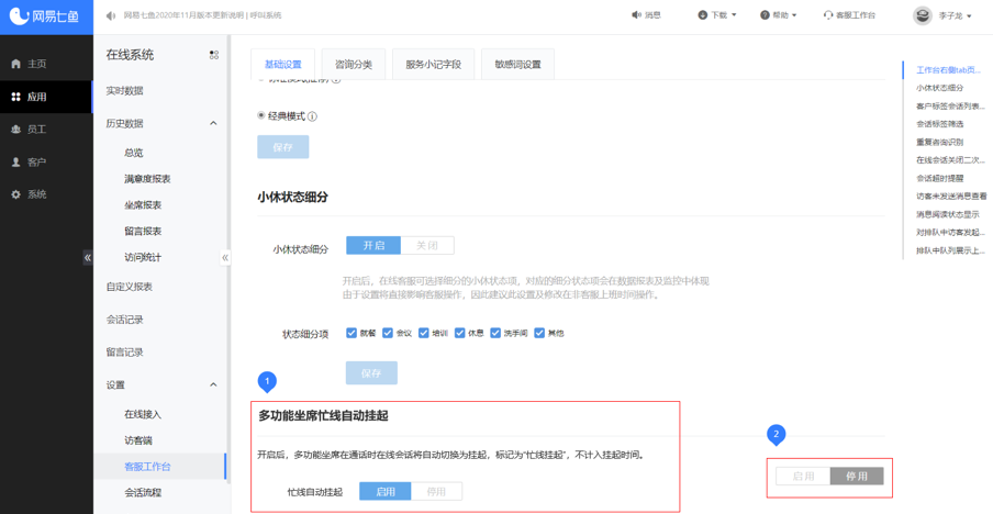 网易七鱼为e签宝提供了一体化工作台+多功能坐席。也就是说,将其多个渠道统一接入到一个工作台,让客服仅在一个窗口即可回复所有平台的咨询消息,大大降低接线压力。同时,当人手不足时,客服也可同时接待电话+在线咨询。但充分考虑到在通话过程中,在线进线容易导致客服无法专注,易造成服务质量下降,网易七鱼支持呼叫和在线会话双双在线且已有电话接通情况下,会话自动切换为忙线状态,待电话挂断后再切回在线。