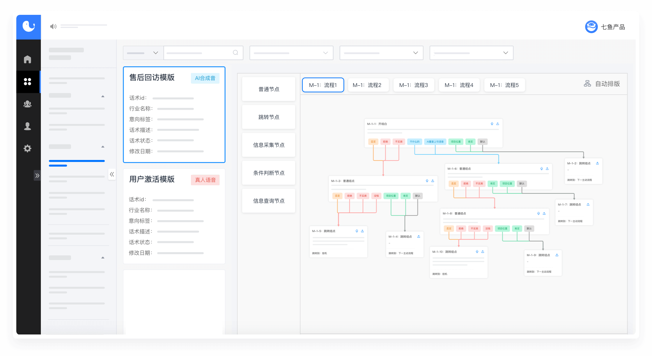 支持复杂的多轮话术灵活配置,画布可拖拽一目了然,AI合成音20+音色可选或上传真人录音,变量拼接自然流畅