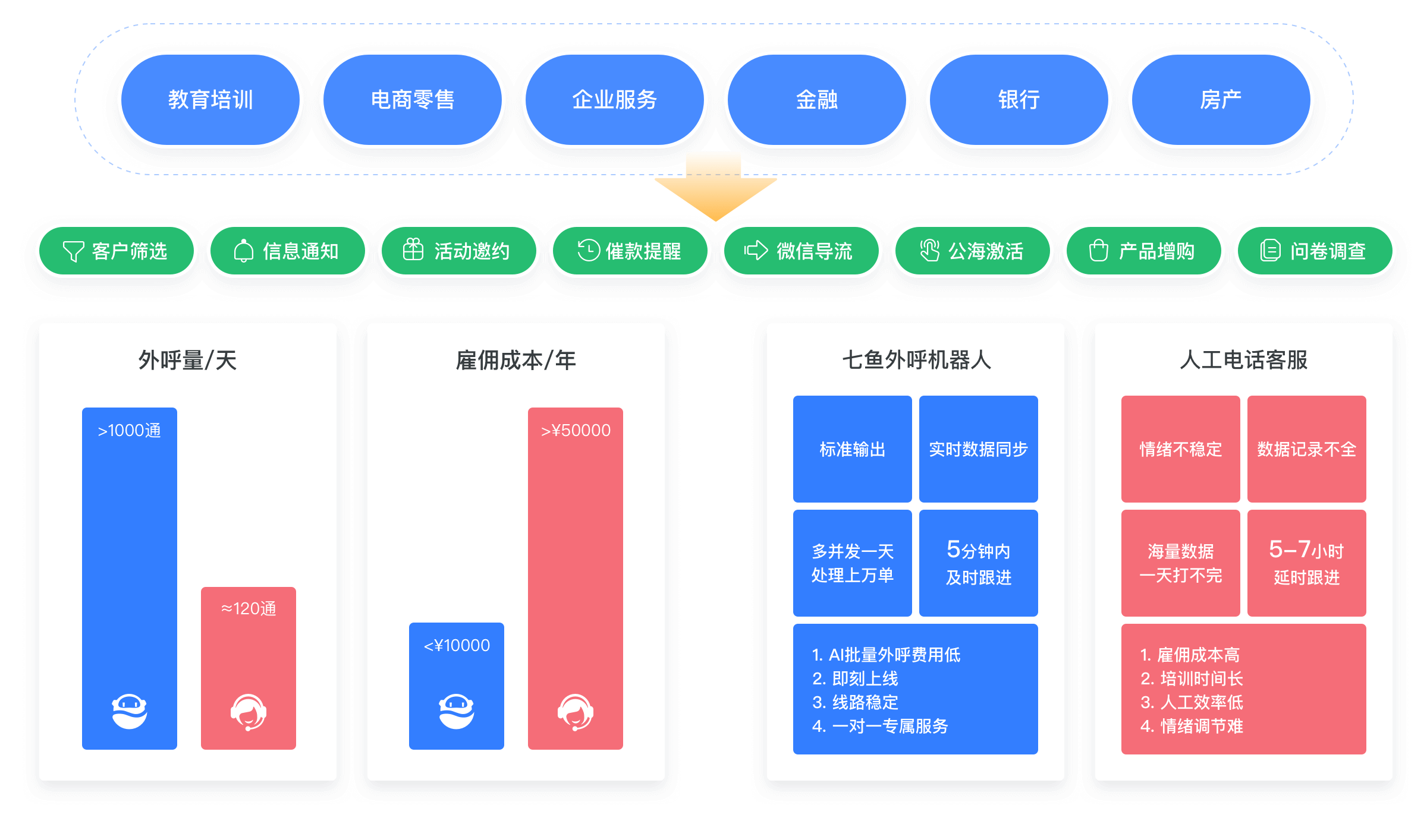 应对海量场景,代替人工自主呼叫多轮交互,赋能企业精准识别目标用户,实现新客增长,提升留存,流失挽回