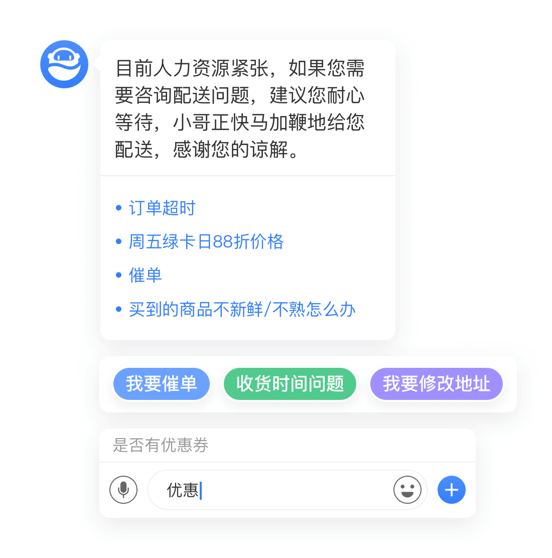 七鱼在线机器人引导消费者对于催单、退换货等问题进行自助解决,秒级响应。同时支持访客输入联想,通过推荐候选提升问题匹配率,打造消费者智能体验。