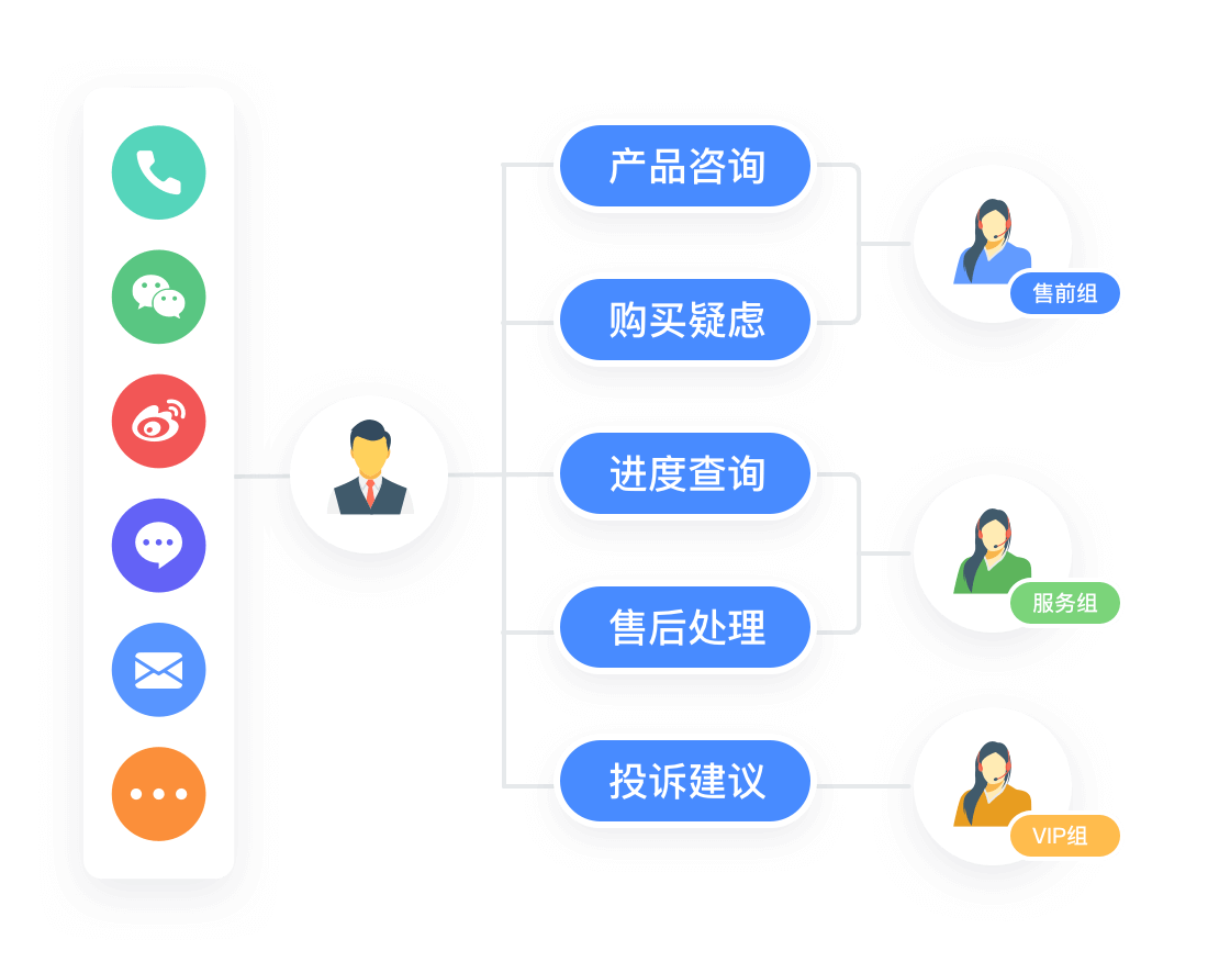 灵活的访客分配及智能会话分流策略,为客户匹配精准的客服,提升问题解决效率。智能的会话分流,在向客户提供优质服务的同时,平衡坐席间的负担。