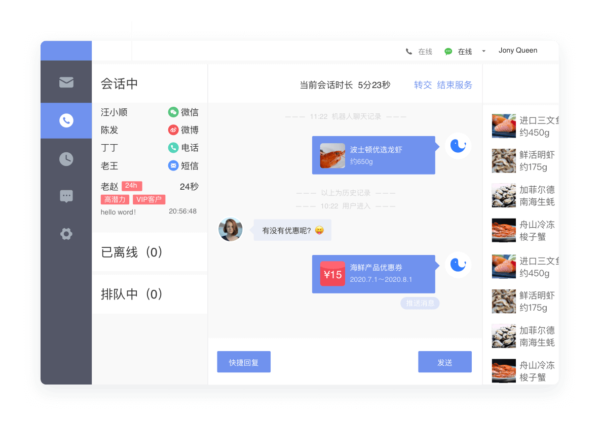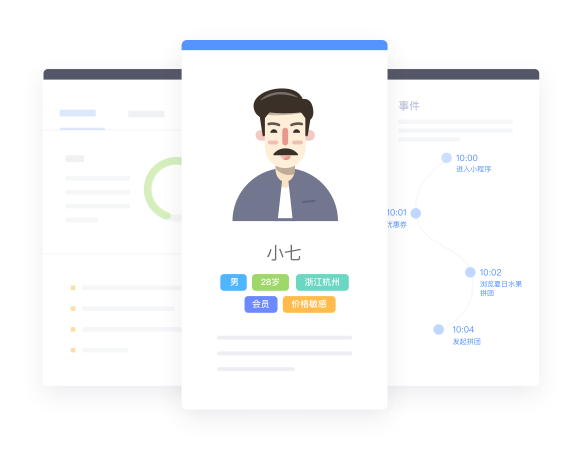 根据潜客的访问深度、点击、事件等行为自定义标签,如"领取红包行为";坐席也可以在服务的同时添加用户属性标签,定位优质用户,发起主动营销和服务。