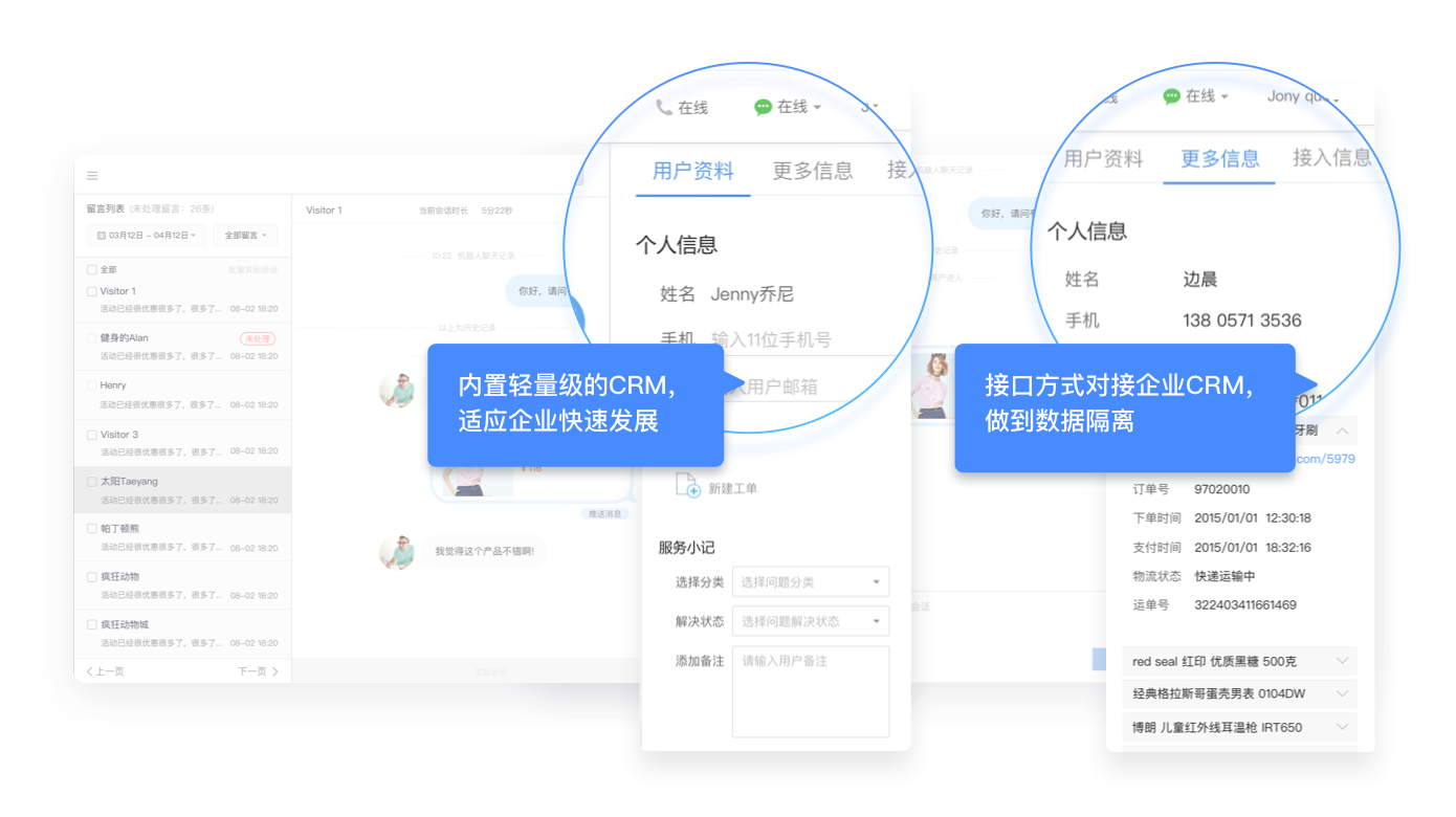 内置轻量级的CRM对接,接口方式深度对接。根据客户信息、咨询入口,智能分配客服,提升30%人效,提升20%满意度,让服务更懂客户。