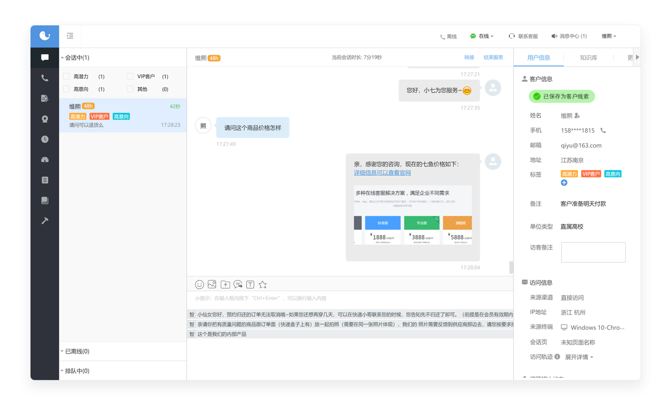 智能分配、输入预知、快捷回复、知识库等多种功能,助力每一次沟通,服务效率、服务专业度显著提升。