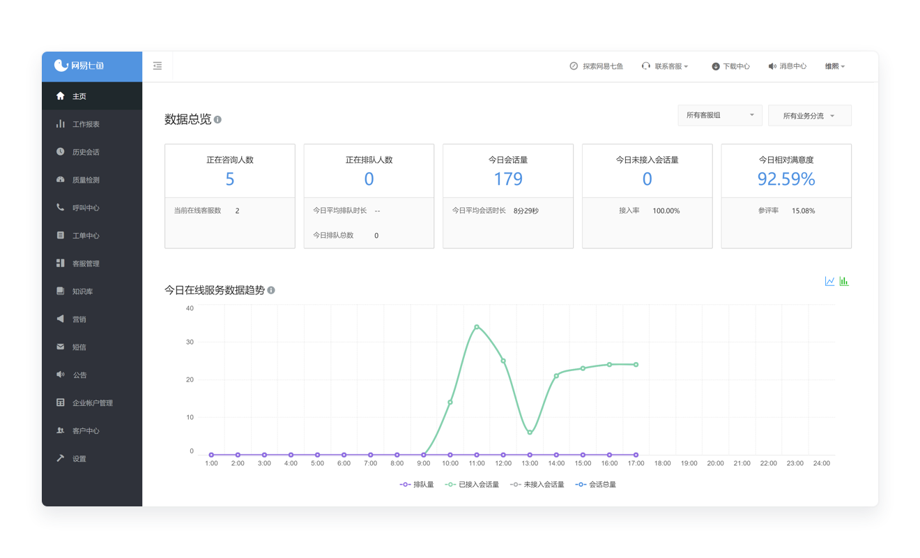 实时监控服务现场,提供超过17项数据报表,全方位反映服务现场、咨询详情、人员绩效。