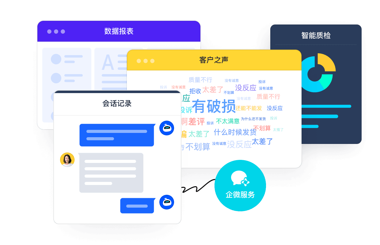 支持企微渠道会话记录、数据报表、智能质检、客户之声、智能场控等板块数据沉淀;